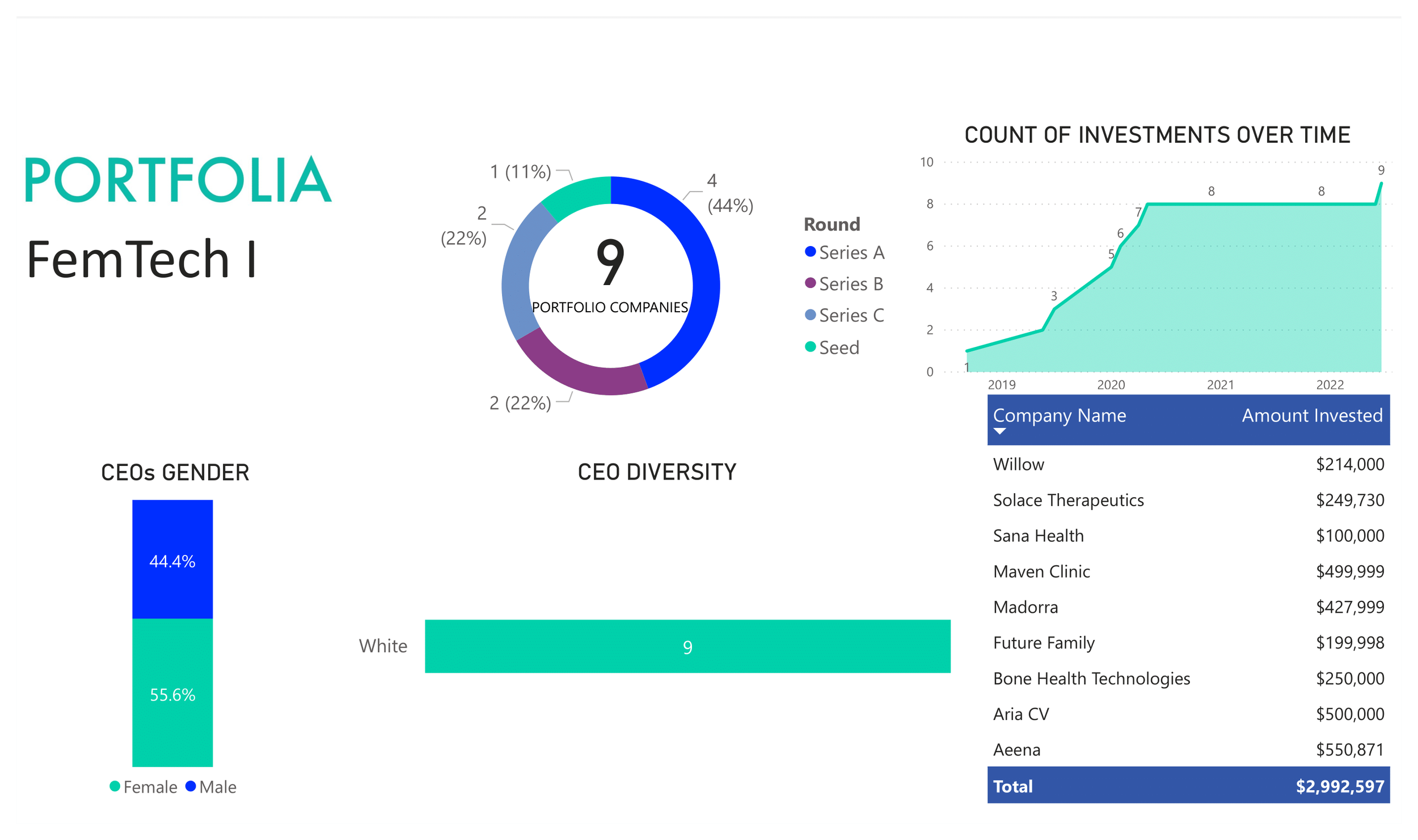 The Portfolia FemTech I Fund is led by a world-class team of highly sophisticated and experienced investors who are leaders in their respective fields, as venture capitalists, angel investors, and innovators. They bring an expert skill-set including sourcing, diligence, deal negotiation, executive recruitment, strategy and governance. Click on photos for full bios.